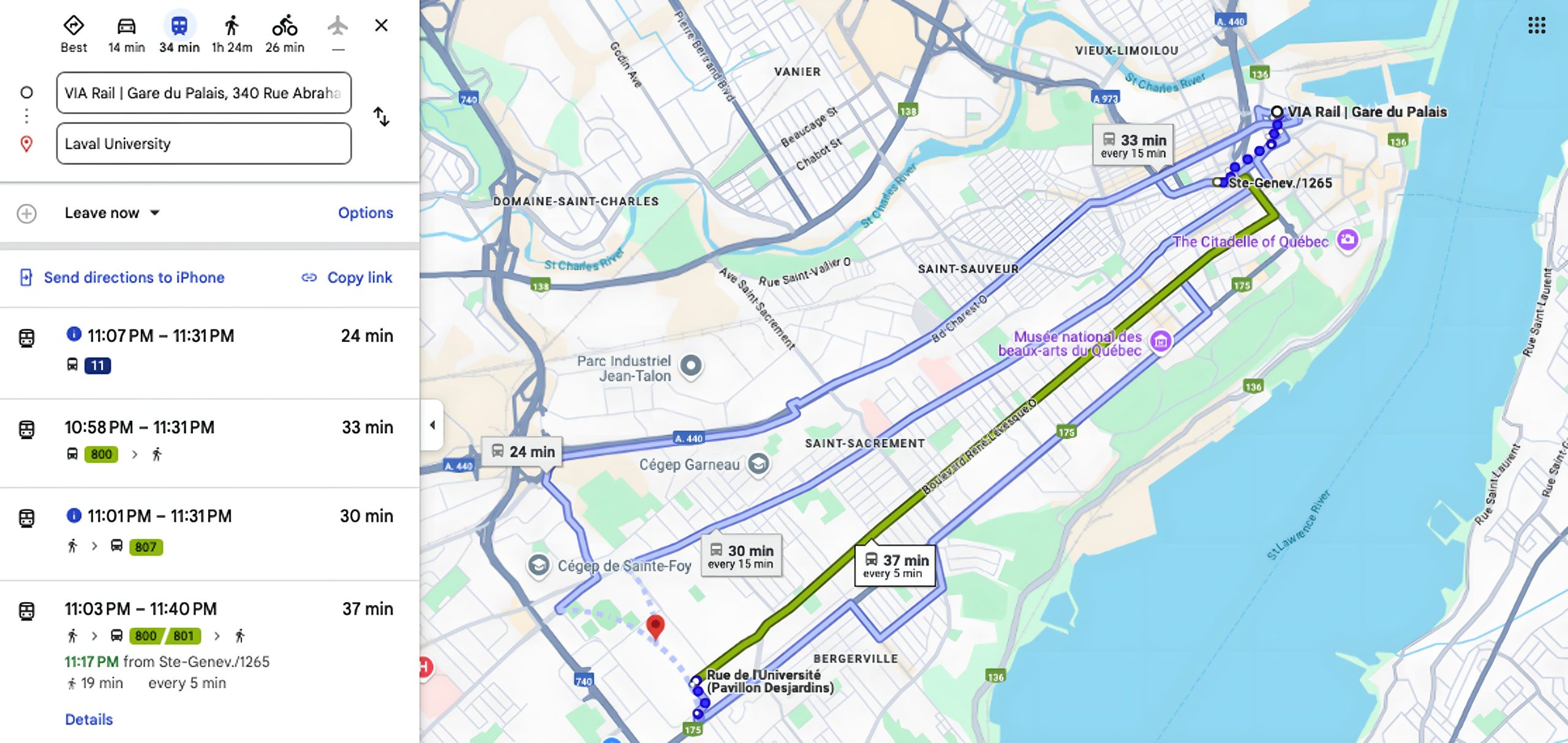 - RTC Buses 800 and 801, par of the city’s high-frequency Metrobus network ,also provide efficient access between the city centre and Sainte-Foy, with connections to stops directly on the university campus.